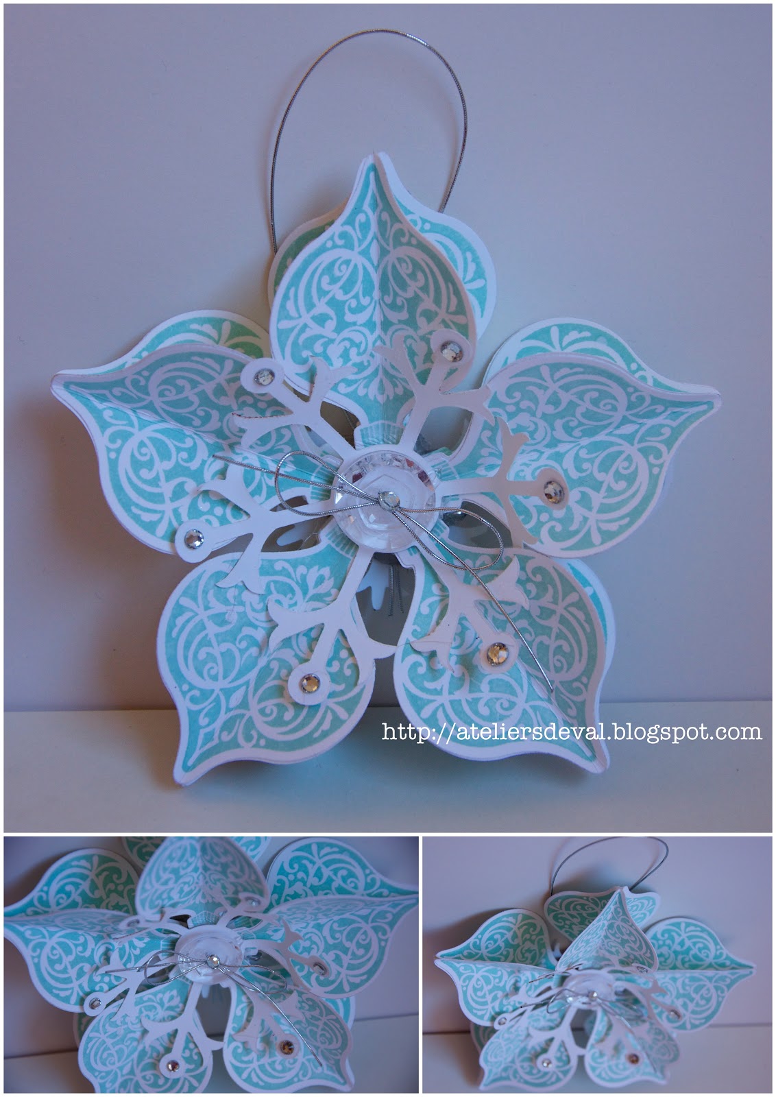 Aujourd'hui, vous avez droit à la version fermée, décorée avec les papiers du catalogue saisonnier : Sous la neige page10, mais aussi le papier à paillettes champagne page 18, qui lui a été découpé avec la plaque big shot tourbillon de flocons page14. J'ai aussi utlisé le tampon cadeau hôtesse